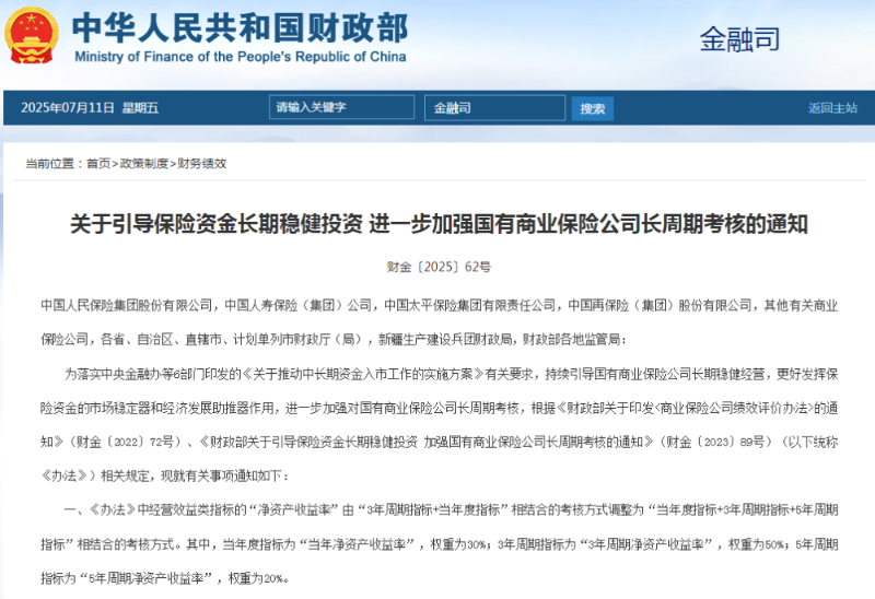 7月11日,财政部公布《关于引导保险资金长期稳健投资 进一步加强国有商业保险公司长周期考核的通知》,升级国有商业保险公司绩效评价标准,全面建立三年以上长周期考核机制,实现了重要的制度性突破。