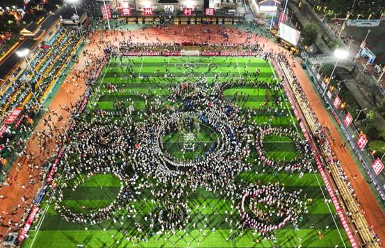 823日,人们在贵州“村超”球场跳苗族芦笙舞(无人机照片)。2025年首届“村超”全国赛总决赛在贵州榕江县“村超”球场举行。广东肇庆金利诚峻足球队2:0战胜广东和平商会足球队,斩获全国总冠军。赛事期间同时举办丰富多彩的民族歌舞展演、无人机表演、大型烟花秀,吸引数万观众现场观赛。新华社记者 杨文斌 摄