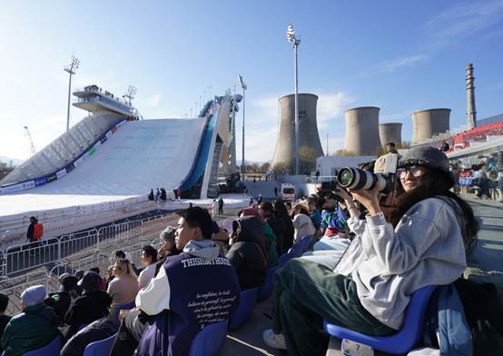 20241130日,观众在首钢大跳台观看2024-2025赛季国际雪联单板及自由式滑雪大跳台世界杯北京站比赛。连日来,多项世界级赛事在“雪飞天”“冰丝带”等北京冬奥会场馆上演,精彩连连。北京冬奥会后,越来越多的冰雪赛事让冰雪流量转化为持续增长的市场价值,一系列高水平赛事在吸引了大量游客前来观赛的同时,拉动了赛事周边消费,让冰雪经济“热起来”。新华社记者 张晨霖 摄