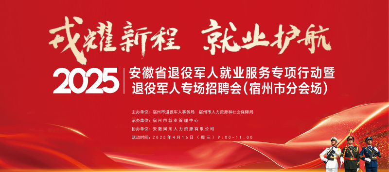 为进一步拓宽退役军人就业渠道,促进退役军人高质量充分就业,宿州市退役军人事务局、宿州市人力资源和社会保障局拟于4月16日(星期三)联合举办“戎耀新程 就业护航”2025年退役军人专场招聘会。诚邀各用人单位和有就业意愿的退役军人参加。