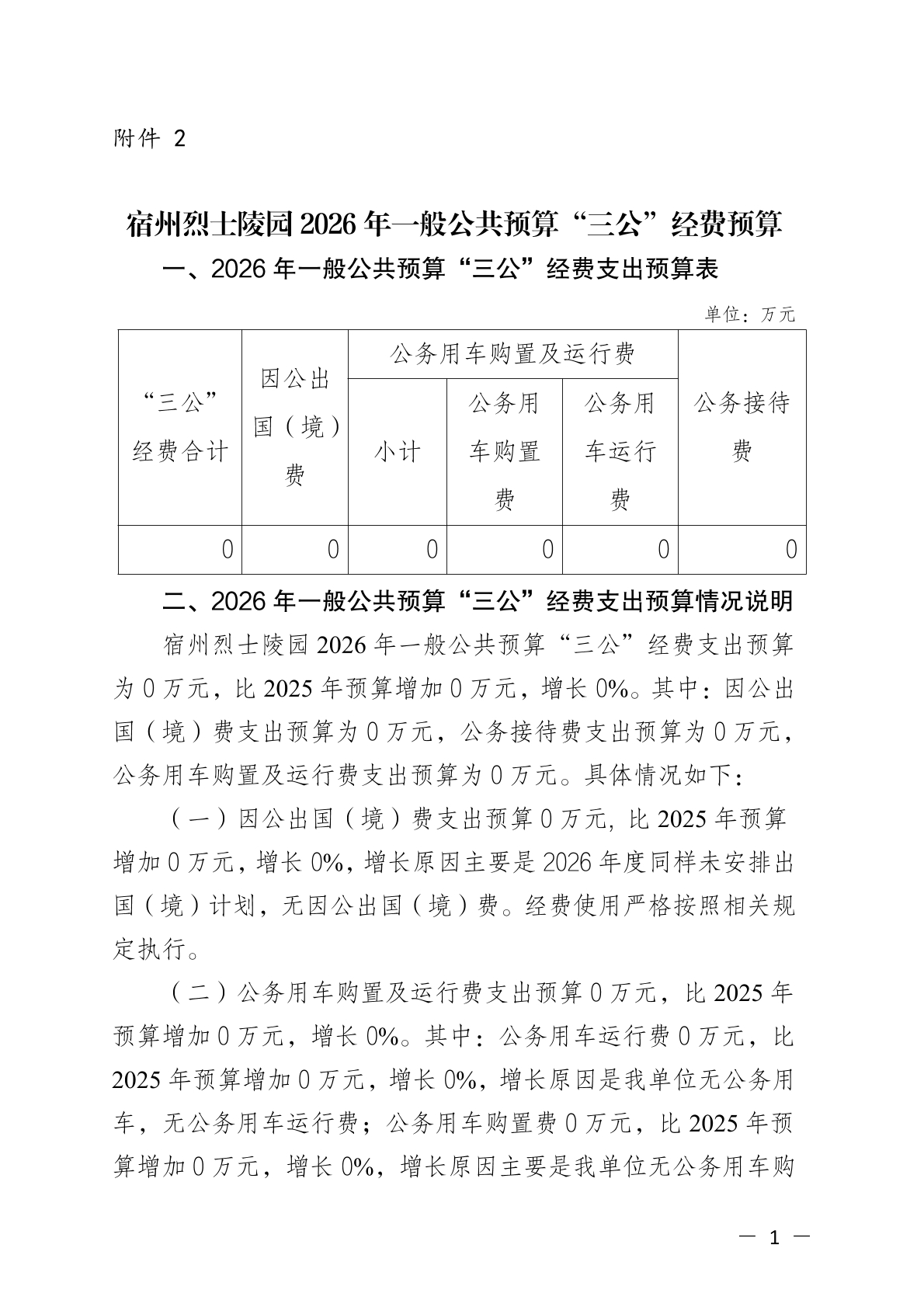 宿州烈士陵园2026年一般公共预算“三公”经费预算