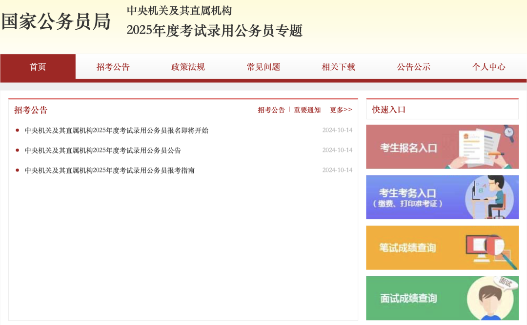 各招录机关的招考人数、具体职位、考试类别、资格条件、咨询电话等详见《中央机关及其直属机构2025年度考试录用公务员招考简章》(以下简称《招考简章》),有关报考政策规定、报名网络技术和考场考务安排等事宜详见《中央机关及其直属机构2025年度考试录用公务员报考指南》(以下简称《报考指南》)。《招考简章》、《报考指南》通过中央机关及其直属机构2025年度考试录用公务员专题网站(以下简称“专题网站”,http://bm.scs.gov.cn/kl2025)公布。