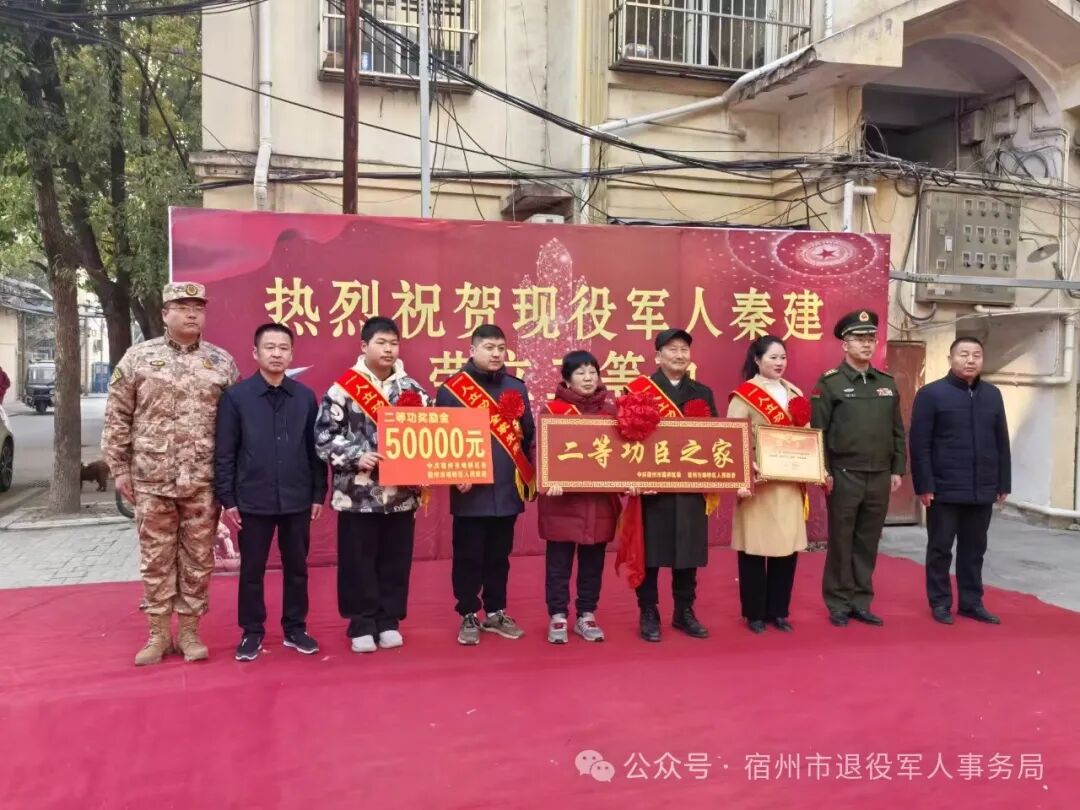 1月21日上午,宿州市埇桥区人武部政委舒彬、区退役军人事务局局长潘永一行前往朱仙庄镇工人村,向荣立二等功现役军人秦建家庭送去喜报。朱仙庄镇委书记赵强,镇委委员、武装部长王环宇等参与。